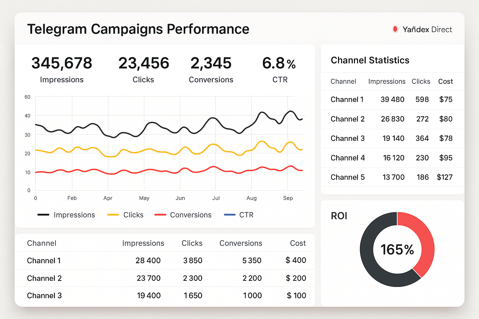 Анализ эффективности рекламных кампаний в телеграм-каналах проводится с использованием стандартных отчетов Яндекс Директа и данных Яндекс Метрики. Основными метриками для оценки являются количество показов, кликов, конверсий, CTR, CPC и стоимость целевого действия.